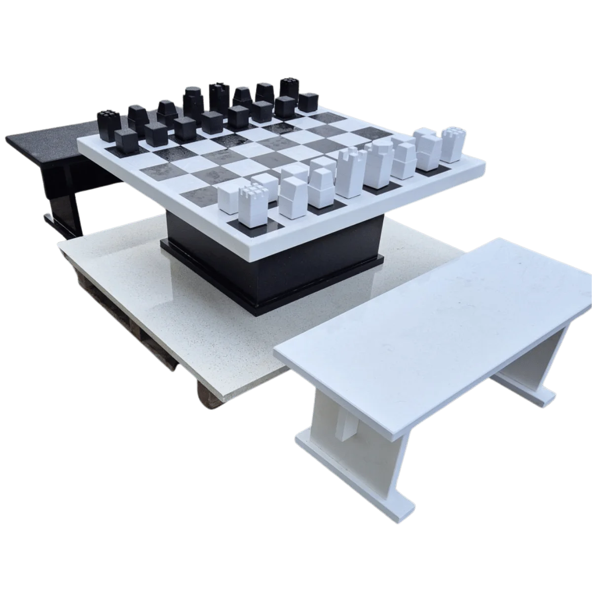 Custom-made granite and quartz chess sets, giant chess sets bespoke to your specifications – £POA price on application. Example shown is 1015mm x 1015mm and is 420mm high with the benches 1000mm long x 400mm wide and 430mm high.