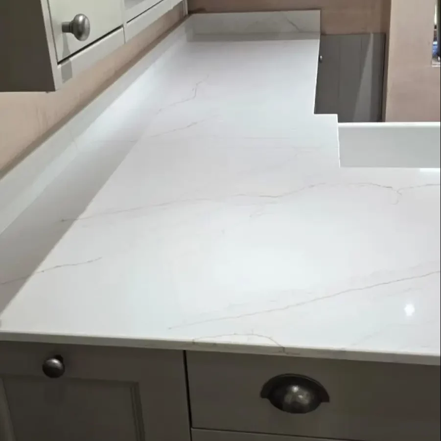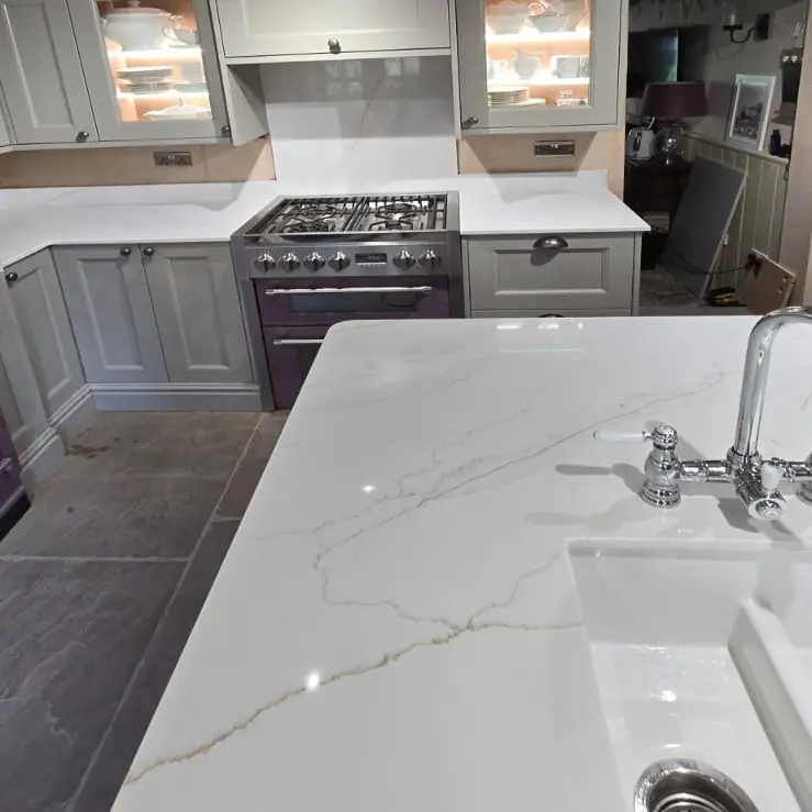 What could be more fitting for a contemporary kitchen worktop in Sowerby Bridge than white veined styled stone surfaces, installed by a local Calderdale worktop company!